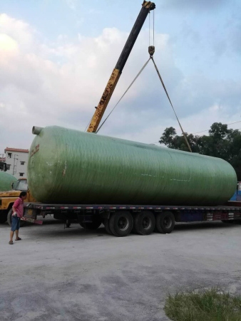 ⑥玻璃鋼化糞池在運(yùn)輸過程中,應(yīng)有可靠的支護(hù)措施,避免滑移和碰撞;超高應(yīng)加紅色標(biāo)志。吊裝時(shí),宜用吊裝帶吊裝,如用鋼絲繩吊裝應(yīng)注意增加鋼絲與罐體接觸面的保護(hù)措施,避免造成罐體損傷或跌滑。不應(yīng)捆縛進(jìn)出口水提吊,不應(yīng)加載吊裝。50立方以下可以直接從清掏口起吊,超過50立方須使用兩條吊帶分別從罐體底部包裹住不應(yīng)少于1/3圓筒起吊。吊裝玻璃鋼化糞池時(shí),宜選擇挖坑后直接從貨車上一次吊裝到位落入基坑,避免二次起吊。入坑后需要吊機(jī)調(diào)整清掏口方向,調(diào)整到正上方合適位置后再挖機(jī)填土固定罐體兩側(cè),防止吊帶抽走后罐體位移或旋轉(zhuǎn)。