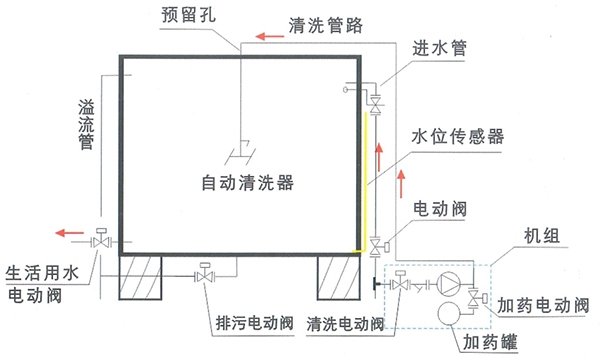 水箱自動(dòng)清洗裝置是利用安裝在水箱中的自動(dòng)清洗器,進(jìn)行全方位勻速旋轉(zhuǎn)并噴射出高壓水柱,擊落粘附在水箱內(nèi)壁的污垢、青苔等雜質(zhì),并迅速排出水箱外;同時(shí),通過管道把消毒液吸溢出來,隨著水柱噴出,達(dá)到三維空間無死角的徹底清洗、消毒效果。產(chǎn)品具有可全方位清洗、自動(dòng)化程度高、消毒效果好、高效低耗能、清洗時(shí)間短、使用壽命長、可自動(dòng)檢測(cè)方位等特點(diǎn)。